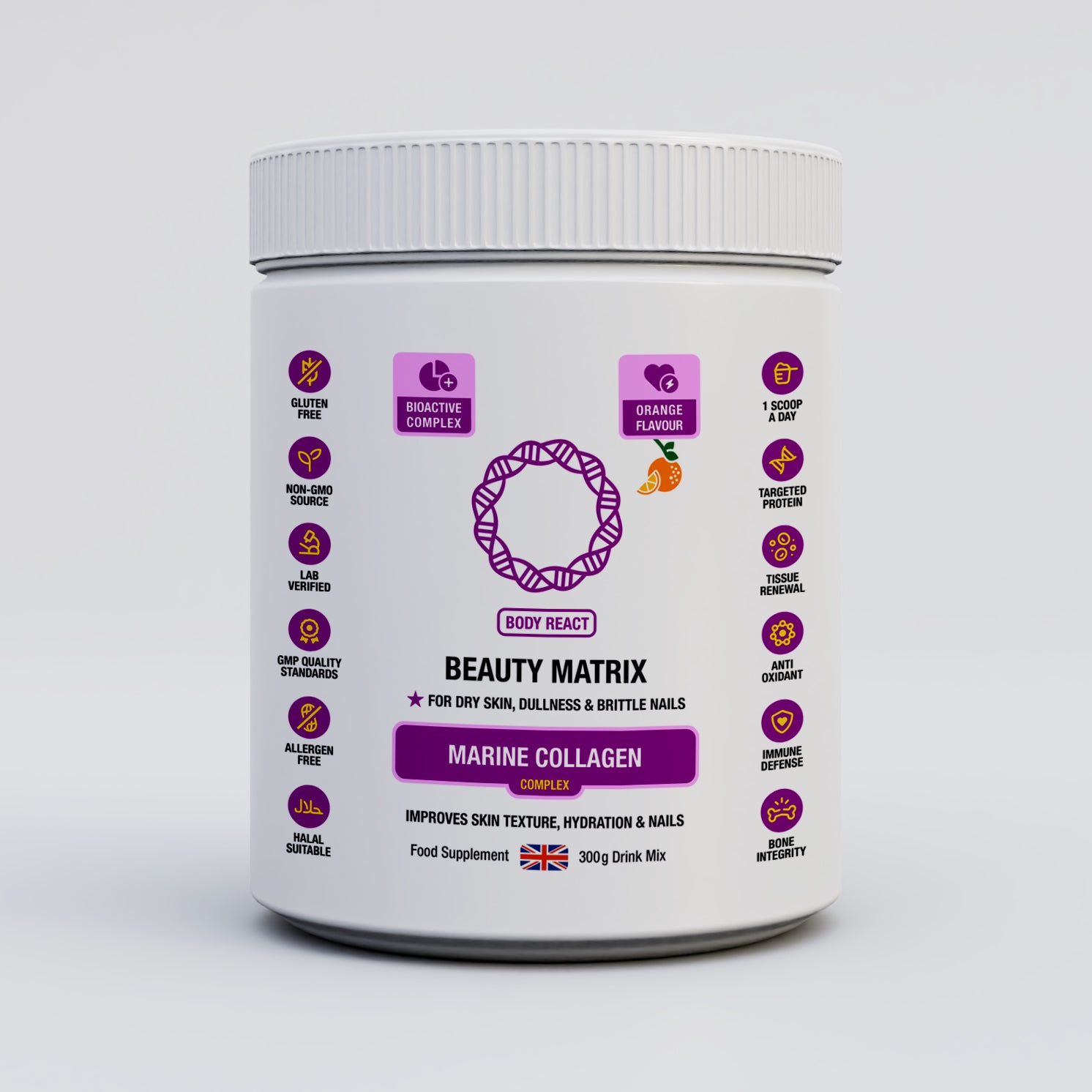 BodyReact® Beauty Matrix is a powdered dermonutrient blend formulated with hydrolysed marine collagen (10,000 mg), hyaluronic acid, and a full-spectrum B-vitamin complex to restore skin hydration, nail strength, and tissue renewal from within. Fortified with Vitamin C (180 mg) to aid natural collagen production, this Marine Collagen Complex helps combat dryness, dullness, and structural fragility — delivering visible resilience, elasticity, and glow.